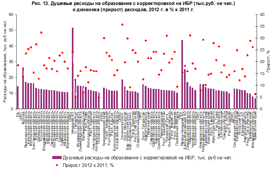 Рис. 13. Душевые расходы на образование с корректировкой на ИБР (тыс.руб. на чел.) и динамика (прирост) расходов, 2012 г. в % к 2011 г. |