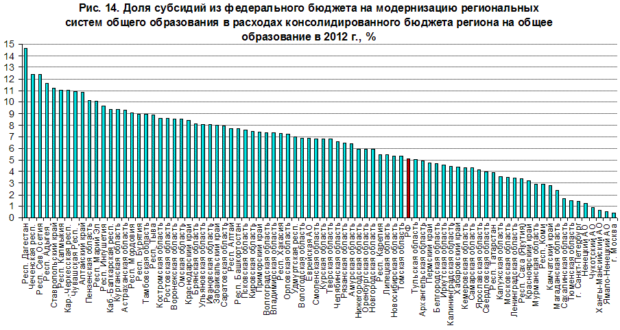 Рис. 14. Доля субсидий из федерального бюджета на модернизацию региональных систем общего образования в расходах консолидированного бюджета региона на общее образование в 2012 г., % |
