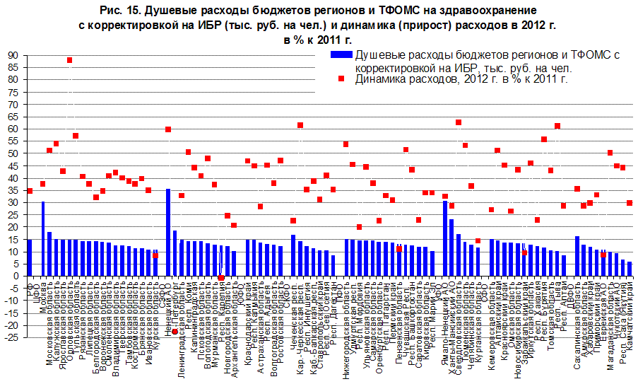 Рис. 15. Душевые расходы бюджетов регионов и ТФОМС на здравоохранение с корректировкой на ИБР (тыс. руб. на чел.) и динамика (прирост) расходов в 2012 г. в % к 2011 г. |