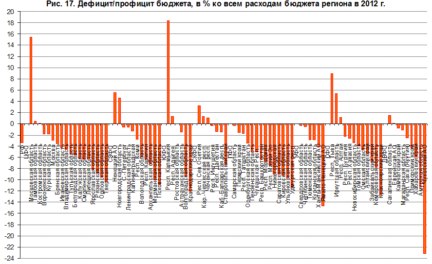 Рис. 17. Дефицит/профицит бюджета, в % ко всем расходам бюджета региона в 2012 г. |