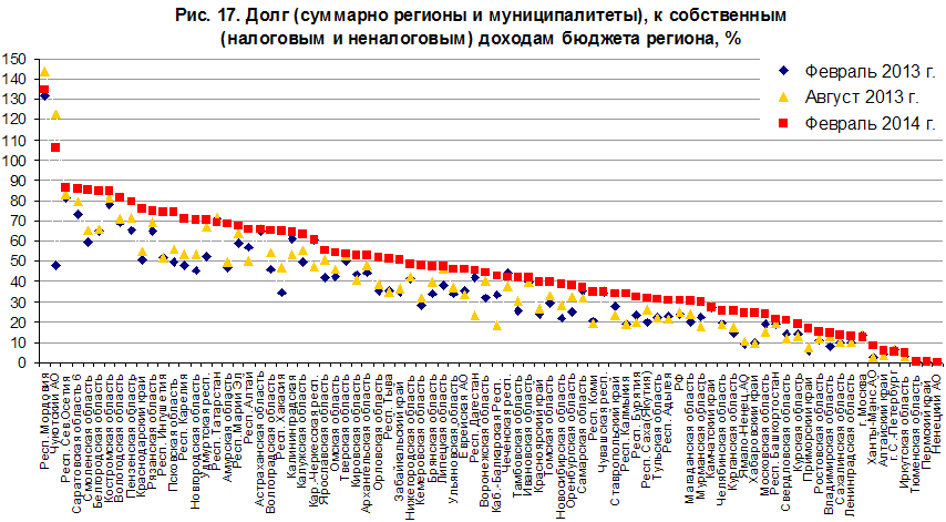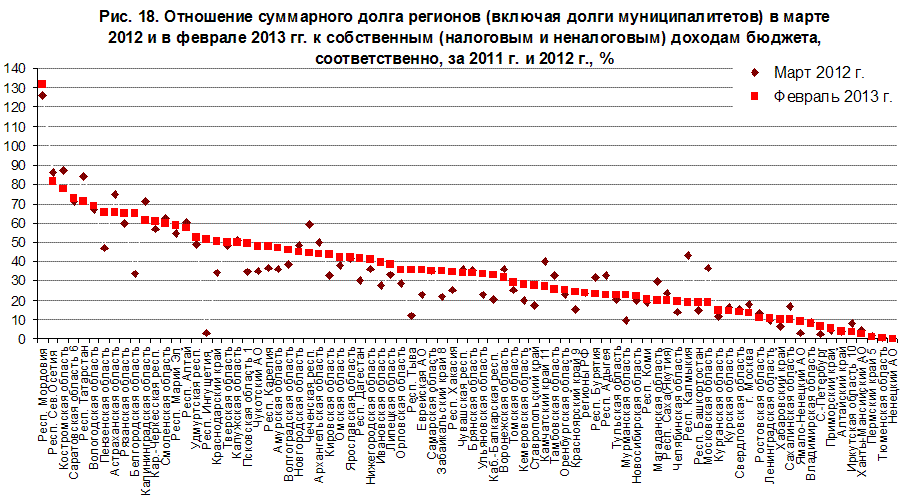Рис. 18. Отношение суммарного долга регионов (включая долги муниципалитетов) в марте 2012 и в феврале 2013 гг. к собственным (налоговым и неналоговым) доходам бюджета, соответственно, за 2011 г. и 2012 г., % |