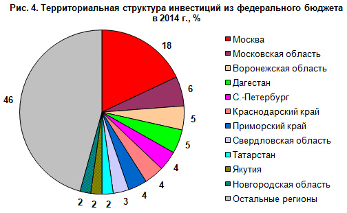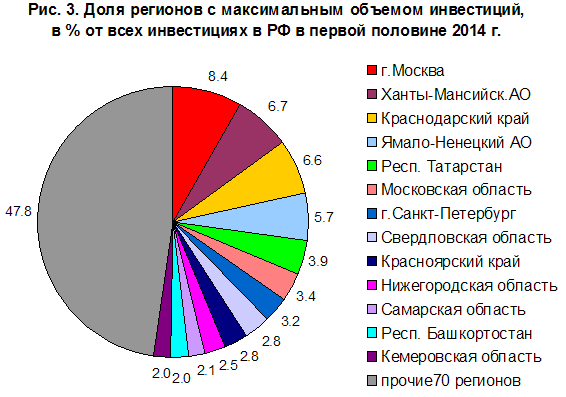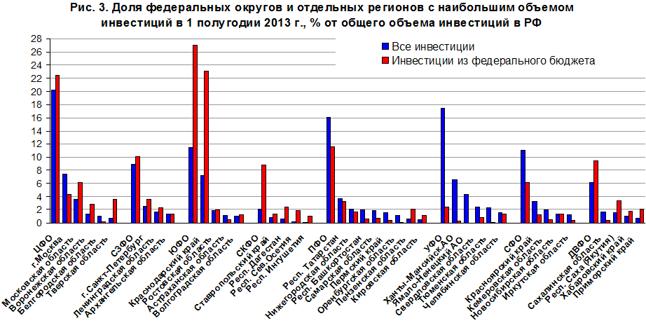 Инвестиции из федерального бюджета распределяются по регионам крайне неравномерно. Приближается Олимпиада, поэтому доля Краснодарского края выросла до 14%. В связи с завершением подготовки к саммиту АТЭС доля федеральных инвестиций в Приморский край снизилась до 6%. По 5% получили в первом полугодии 2012 г. республики Дагестан и Якутия. География инвестиций из бюджетов регионов совсем иная. На Москву приходится 25% всех инвестиций из бюджетов регионов, на С.-Петербург – 8%, на Татарстан – почти 7%, на автономные округа Тюменской области – по 4-5%. Все остальные регионы имеют небольшие доли и объемы инвестиции из собственных бюджетов из-за низкой финансовой обеспеченности.