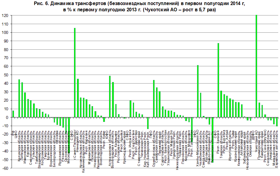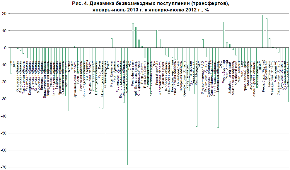 Самая большая проблема – сокращение трансфертов, негативную динамику имели 68 регионов (рис. 3). Среди них все регионы Южного, Уральского и Крымского ФО, Сибирского ФО (кроме Тывы), Приволжского (кроме Чувашии), подавляющее большинство регионов Северо-Запада (кроме Калининградской и Вологодской областей). Особенно чувствительно сокращение трансфертов высокодотационным Севастополю (вдвое) и республике Крым (на четверть), возможно, что это связано со сдвигом их выделения на второе полугодие. Выросли трансферты лишь немногим регионам и по разным причинам. Максимальный рост (в три раза) имела Калининградская область, которой Минфин компенсирует утрату льготного режима особой зоны весной 2016 г. Значимую прибавку получили Ингушетия и Чечня, поддержка этих республик не сокращается по политическим причинам даже при дефиците федерального бюджета. Увеличены трансферты отдельным регионам с высокой долговой нагрузкой и сокращением помощи годом ранее (Смоленская обл.). Резкий рост трансфертов Сахалину объясняется эффектом базы (доля трансфертов в доходах бюджета области минимальна – 1,7%). Следует учитывать, что полугодовые данные недостаточно репрезентативны, так как трансферты выделяют неритмично в течение года: какие-то регионы выбивают помощь раньше, какие-то получают позже, что подтверждается совсем иной картиной динамики за первое полугодие 2015 г. Но общий тренд существенного сокращения трансфертов подавляющему большинству регионов вряд поменяется к концу 2016 г.