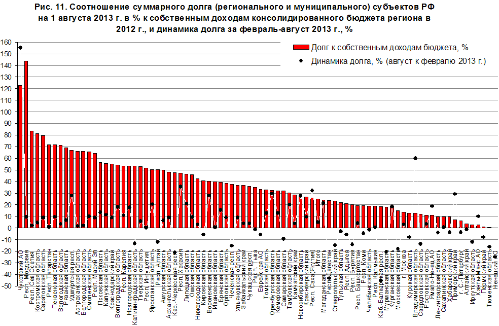 В числе проблемных как менее развитые регионы с небольшой налоговой базой, которым пришлось занимать на исполнение текущих расходных обязательств бюджета, так и регионы с займами на инвестиционные цели, среди последних Татарстан, Краснодарский край, Калужская и Калининградская области. В конце 2012 г. федеральные власти приняли решение помочь Татарстану. Выплаты по бюджетным займам на инвестиционные цели (подготовку к Универсиаде) были пролонгированы на 10 лет по сверхнизкой ставке (0,5% годовых). За десятилетие инфляция съест не менее 60-70% долга, т.е. фактически займы из федерального бюджета простили. Но такое "ручное управление" в целях поддержки регионов, особо значимых для федеральных властей, не имеет ничего общего с системным решением проблемы.