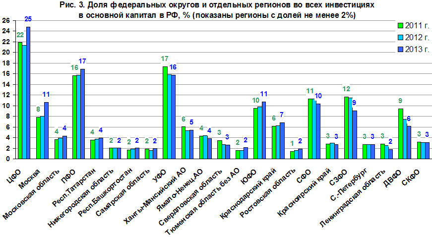 По сравнению с предыдущим годом распределение инвестиций по федеральным округам и регионам изменилось несущественно, они в основном концентрируются в территориях с явными конкурентными преимуществами (рис. 3). При этом агломерации федеральных городов (Москва с Московской областью и С.-Петербург с Ленинградской областью) суммарно получают на четверть больше инвестиций, чем главные нефтегазовые "кормильцы" страны – Ханты-Мансийский и Ямало-Ненецкий автономные округа Тюменской области. Впервые к группе лидеров добавился Краснодарский край (7% всех инвестиций), с большой вероятностью его доля будет расти в 2013 г. Продолжает расти и доля Дальнего Востока благодаря инвестициям государства и госкомпаний.