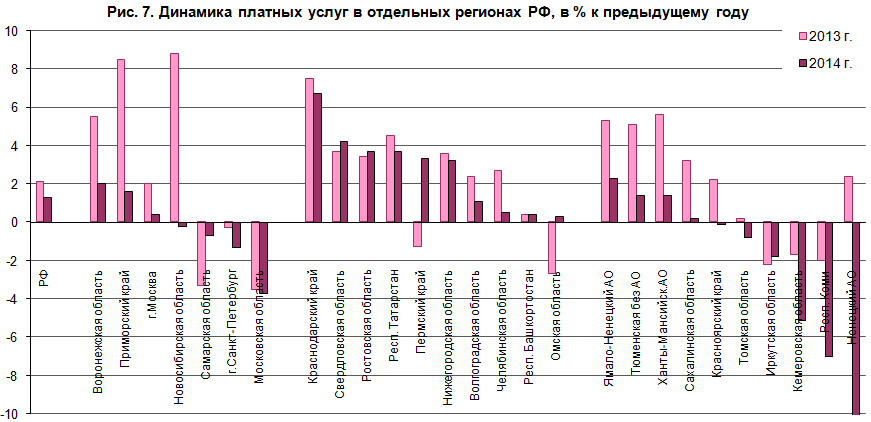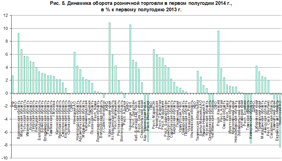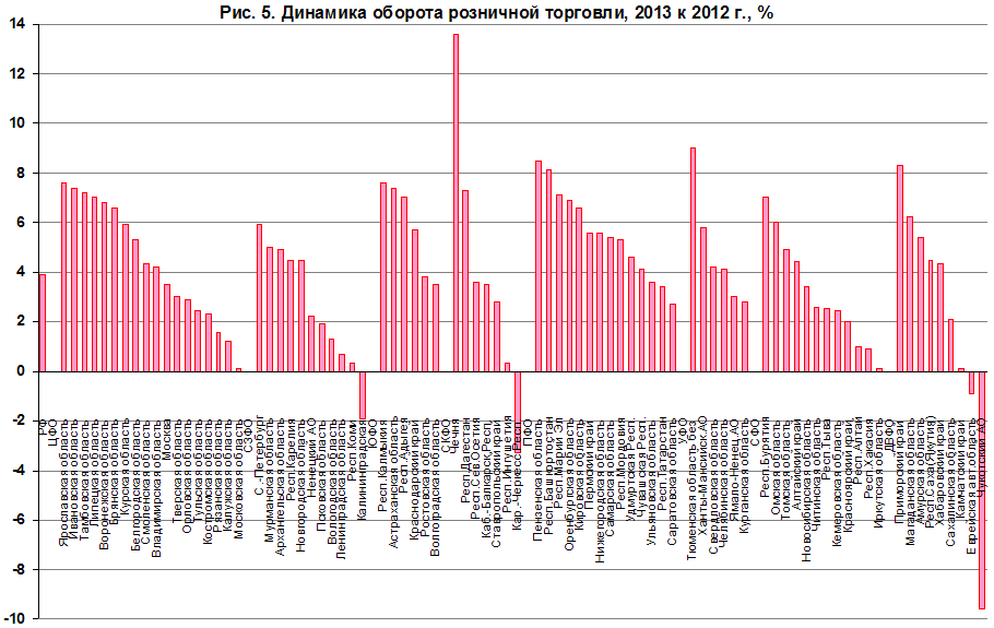 Оборот розничной торговли восстановился после кризисного спада быстрее других экономических индикаторов – уже в 2010 г., а в 2012 г. вырос в среднем России на 6% по сравнению с предыдущим годом. Самые высокие темпы роста показали Воронежская и Вологодская области, Ставропольский край (на 15-19% в 2012 г.), на востоке страны – республика Хакасия и Амурская область (на 14-16%). Все они имеют пониженные душевые показатели, поэтому рост шел быстрее благодаря эффекту низкой базы. Из развитых регионов значительным ростом оборота розничной торговли выделялся только Красноярский край (на 12%). Только в Чукотском АО динамика оборота розничной торговли была отрицательной.