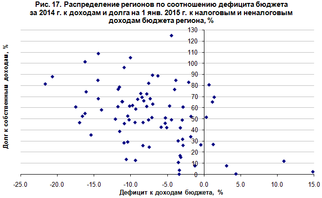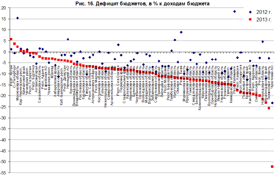 В 2012 г. напряженность бюджетов регионов резко усилилась. Доходы выросли только на 5%, а в 15 субъектах РФ они сократились. Во всех регионах выросли социальные обязательства в соответствии с решениями федеральных властей. Выполнить приоритетные обязательства за счет имеющихся доходов оказалось не под силу большинству регионов. В 2012 г. дефицит консолидированных бюджетов субъектов РФ вырос в 8 раз по сравнению с 2011 г. (278 и 35 млрд. руб. соответственно) и составил 3,3% всех расходов бюджетов (рис. 17). Дефицит бюджета имели 64 региона из 83, при этом в 44 регионах он превышал средний уровень (3,3% всех расходов). Наиболее велик дефицит в Чукотском АО (23% всех расходов бюджета), Ямало-Ненецком АО (15%), а также в Красноярском и Краснодарском краях, республике Удмуртия, Ульяновской, Амурской, Мурманской, Псковской, Тверской, Орловской, Рязанской областях (9-13%). Все они быстро наращивали расходы своих бюджетов несмотря на доходные ограничения, причем только часть регионов увеличивала инвестиционные расходы, а остальные просто не справлялись с возросшими социальными обязательствами. География проблемы дефицита видна на графике – она достигает максимальной остроты в многочисленных среднеразвитых регионах Центра, Поволжья, Сибири и др. Самым богатым субъектам РФ денег пока еще хватает, хотя и не всем, а бедных (республики юга и удаленные дальневосточные регионы) "кормит" федеральный бюджет.