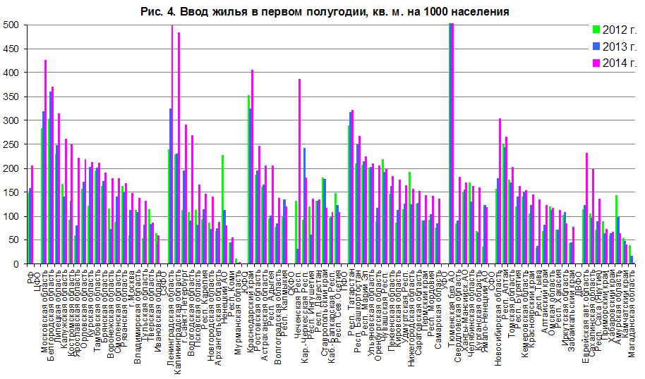 Рис. 4. Ввод жилья в первом полугодии, кв. м на 1000 населения |