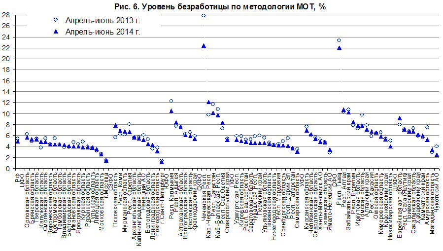 Рис. 5. Уровень безработицы по методологии МОТ, % (без Чечни и Ингушетии) |