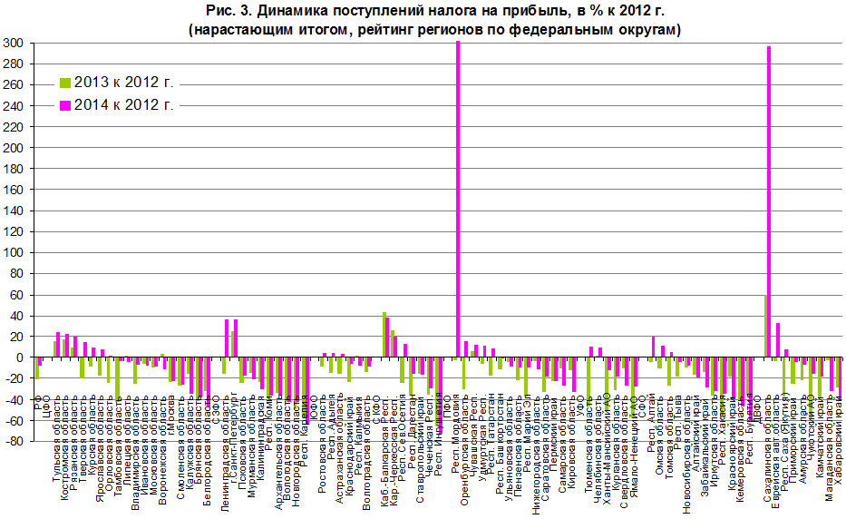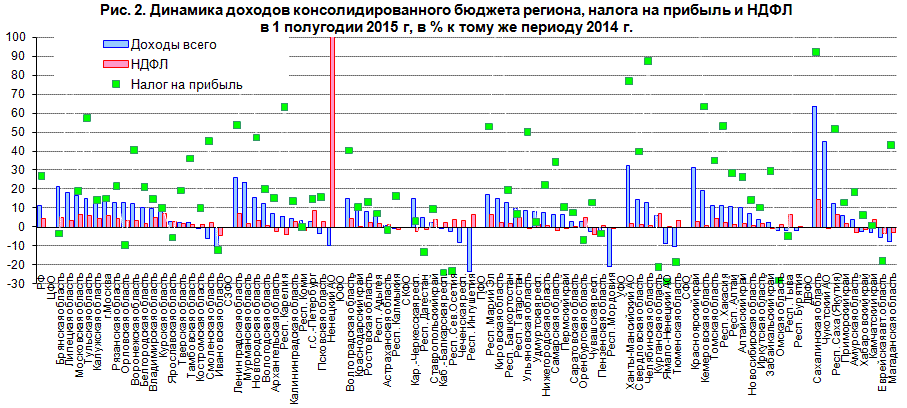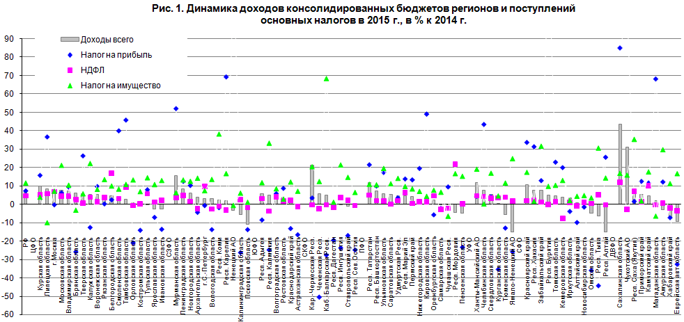 Динамика поступлений основных налогов сильно различалась по регионам. Поступления налога на прибыль сократились в 36 регионах, сильнее всего – в республике Мордовия (-70%) из-за искусственно завышенной базы 2014 г., в Омской области (-35%) вследствие политики "Газпромнефти" и банкротства крупной строительной компании "Мостовик", в Ямало-Ненецком АО (-26%) также из-за политики "Газпрома", в Калининградской области – из-за спада в автопроме. Потери налога на прибыль чувствительны для бюджетов этих регионов. Такое же сокращение в ряде слаборазвитых республик (Чечня, Тыва и др.) и в депрессивных регионах (Курганская обл., Еврейская авт.обл.) малозначимо для их бюджета, т.к. доля налога на прибыль в доходах мала.