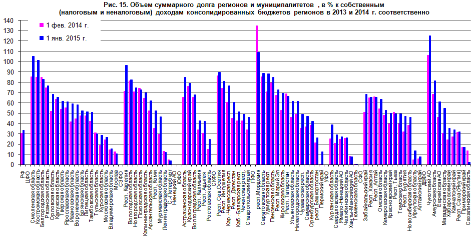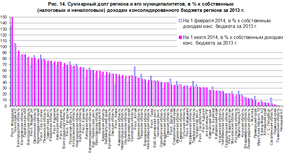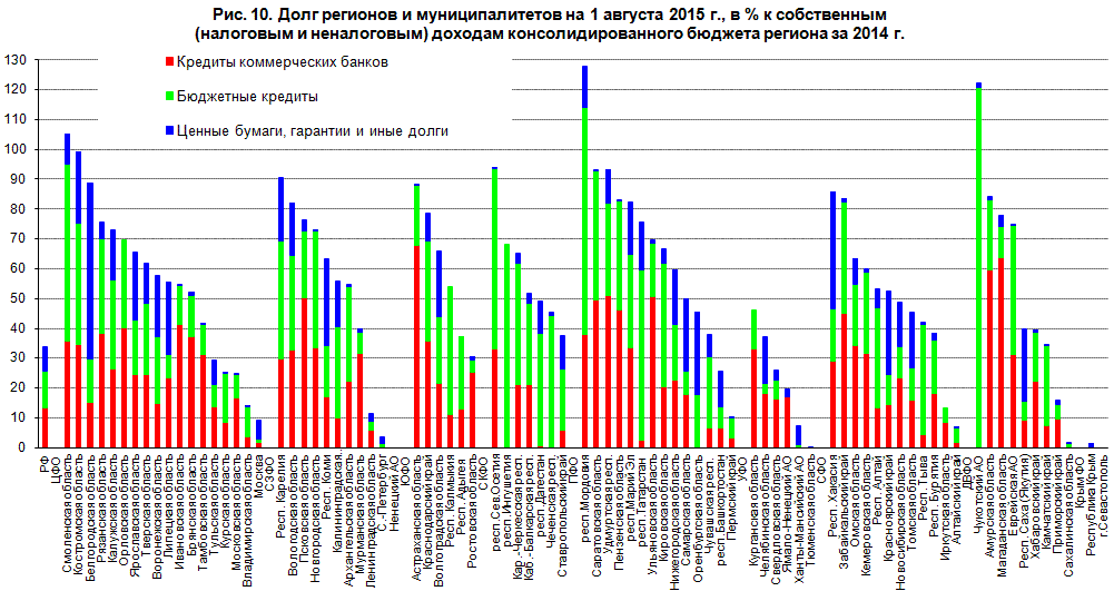 Рис. 8. Суммарный долг регионов и муниципалитетов на 1 августа 2016 г., в % от собственных (налоговых и неналоговых) доходов консолидированного бюджета региона за 2015 г. |