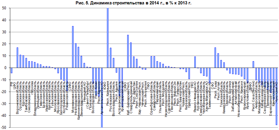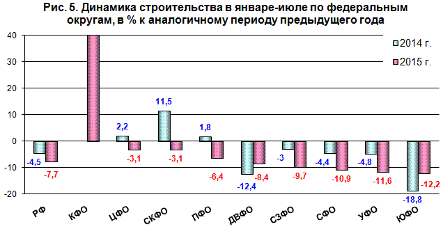 Спад в жилищном строительстве начался позже, сокращение платежеспособного спроса населения привело к снижению объема ввода жилья только через два года. Максимальный спад отмечался в первом полугодии 2016 г. (-9,2%), в январе-июле 2016 г. его темпы снизились (-7,4%), но это следствие эффекта более низкой базы, поскольку ввод жилья начал падать только с лета 2015 г. По данным за январь-июль 2016 г., отрицательную динамику имели 54 региона (рис. 4). Наиболее резкие изменения – как рост, так и спад – характерны для регионов с малым объемом ввода жилья, это эффект низкой базы. В регионах с большим объемом жилищного строительства динамика разная: в Московской области, где объем ввода жилья максимален – более 10% от общероссийского, продолжался рост (+6%), а в Москве ввод жилья сократился на 28%. Наоборот, в С.-Петербурге ввод жилья вырос на 9% на фоне незначительного сокращения в Ленинградской области. В остальных регионах со значительным объемом ввода жилья динамика негативная: в Краснодарском крае, Ростовской области, республиках Татарстан и Башкортостан – спад на 2-7%. Самое сильное сокращение в Тюменской области ("чемпионе" по вводу жилья в душевом выражении) – на треть, это следствие сжатия финансирования программы строительства жилья в Тюмени для жителей Севера, которая осуществлялась за счет бюджетов двух автономных округов Тюменской области.