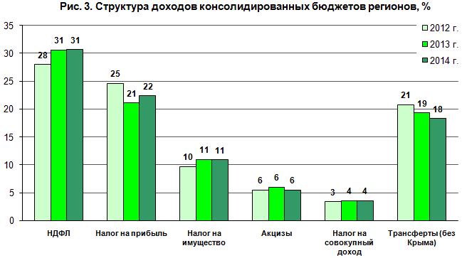 Рис. 3. Структура доходов консолидированных бюджетов регионов в 2015 г., % |