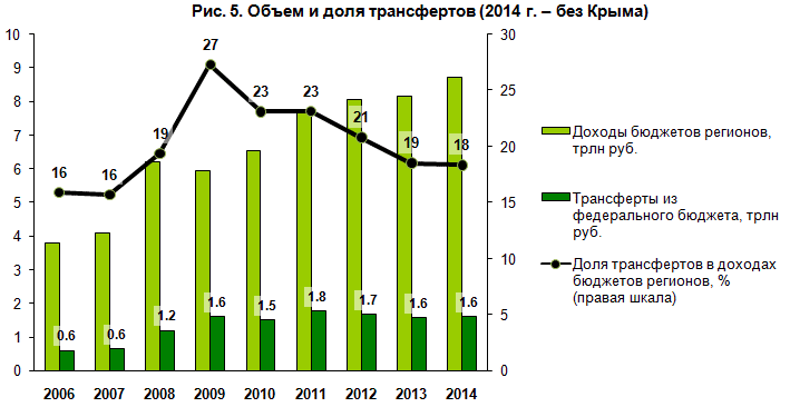 Состояние бюджетов регионов стало ухудшаться в конце 2012 г., когда регионам, в основном за счет средств собственных бюджетов, пришлось выполнять указы президента о повышении заработной платы занятым в публичном секторе, несмотря на замедление роста доходов бюджета в условиях экономической стагнации, а затем кризиса. В 2015 г. доходы бюджетов регионов росли быстрее (на 6% к 2014 г. в номинальном выражении) по сравнению с расходами (на 1%). Рост доходов обеспечили поступления налога на прибыль (рост на 7%), основные плательщики которого – крупные экспортные компани и банки, а также налога на имущество (на 12%), также с максимальной долей платежей крупного бизнеса. Главный для региональных бюджетов налог – на доходы физических лиц (НДФЛ) – рос медленно (на 4,7%), как и номинальная заработная плата.