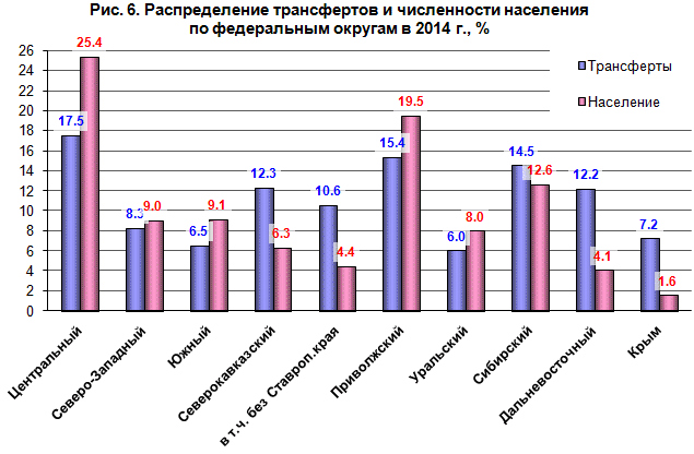 Средняя картина не отражет регионального разнообразия. В 15 регионах расходы бюджетов сократились (рис. 5), сильнее всего – в Калмыкии и Ненецком АО (на 10-14%), в Забайкальском крае и в Кемеровской области (на 6-7%). Более всего выросли расходы субъектов Крыма (на 24-34%), несмотря на резкое сокращение трансфертов, а также Калининградской области и Ингушетии (на 20-21%), которым, наоборот, значительно увеличили помощь.