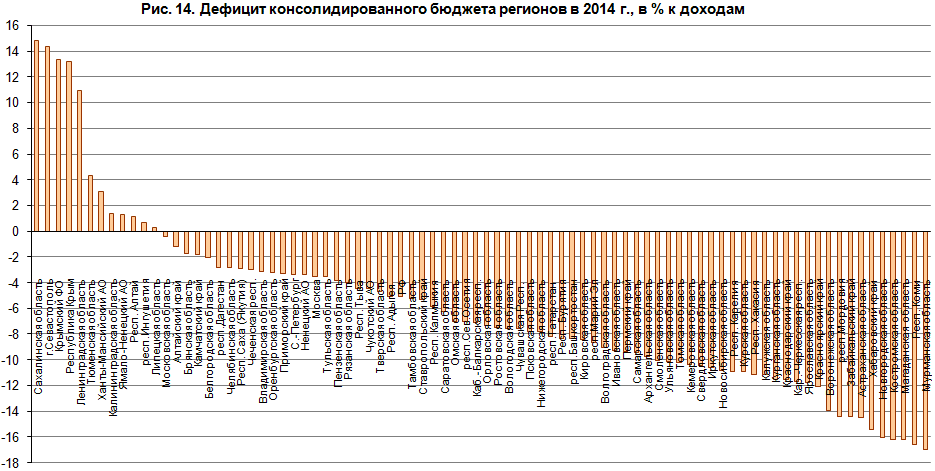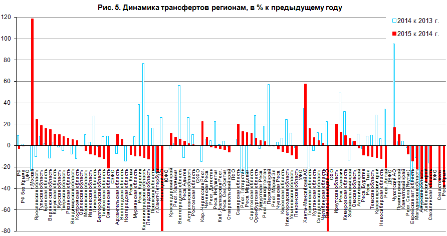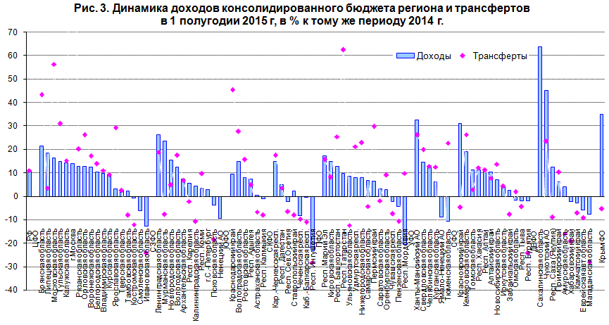 Региональная картина сильно дифференцирована: в 23 регионах доходы бюджетов в 2015 г. сократились, особенно существенно – в Ямало-Ненецком АО и республике Алтай из-за сокращения трансфертов (рис. 1). Сокращение доходов республики Крым и Севастополя обусловлена изменением системы распределения трансфертов (см. ниже).