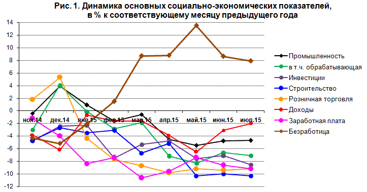 Помесячная динамика основных индикаторов в целом по России показывает, что кризисный спад завершился в промышленности, перестала сокращаться заработная плата, остается низким уровень безработицы. Однако в инвестициях и строительстве, в реальных доходах населения и потреблении спад продолжается, хотя и более медленно (рис. 1).