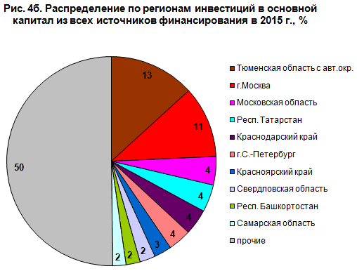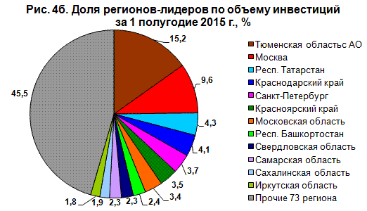 География инвестиций по-прежнему ориентирована на регионы с явными конкурентными преимуществами – ресурсными и агломерационными. Ведущие нефтегазодобывающие Ханты-Мансийский и Ямало-Ненецкий АО суммарно получили 14% от всех инвестиций в стране, с Тюменской областью – более 16%. Еще одна группа лидеров – крупнейшие агломерации, на Москву пришлось 11% всех инвестиций, на Московскую область и С.-Петербург – по 4%. Заметную долю инвестиций получили также Татарстан (4%), Красноярский край (3,5%), Сахалин (2%), что во многом связано с добычей нефтегазовых ресурсов. В Краснодарском крае (его доля – менее 3%) инвестиции падают третий год подряд.