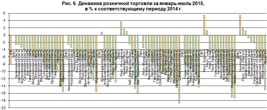 Потребление населения сокращалось теми же темпами, что и доходы: оборот розничной торговли за январь-июль 2016 г. сократился на 5,6% к аналогичному периоду 2015 г., спад охватил 75 регионов (рис. 8). В их числе все регионы Урала, Сибири, почти все регионы Приволжского и Северо-Западного ФО, за исключением Ленинградской области. По данным статистики, особенно сильно снизился объем розничной торговли в Москве (-12%) и в Омской области (-17%), что существенно хуже динамики доходов населения и поэтому вызывает сомнения. Наоборот, на Дальнем Востоке снижение розничной торговли относительно небольшое по сравнению со спадом доходов населения. При всех дефектах региональной статистики доходов населения и потребления вполне очевидно, что в подавляющем большинстве регионов сохраняются негативные тенденции, население продолжает "затягивать пояса".