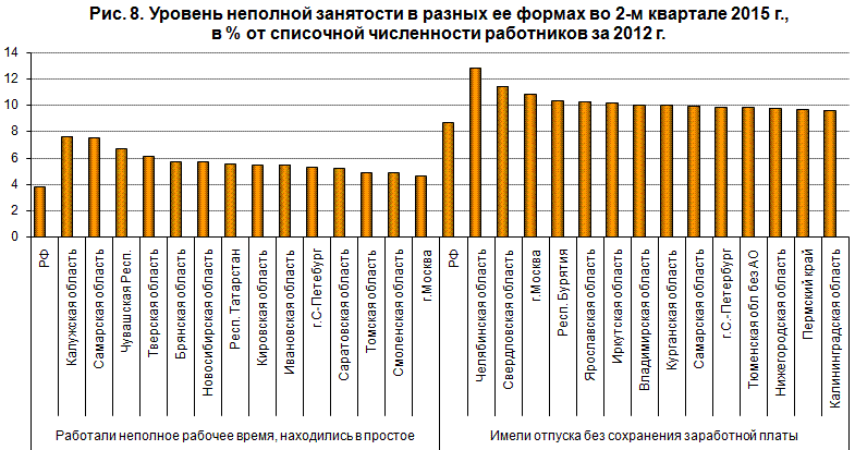 Рис. 6. Доля занятых неполное рабочее время и находящихся в отпусках без сохранения заработной платы, в % от списочной численности занятых (на графике представлены регионы с максимальными показателями) |