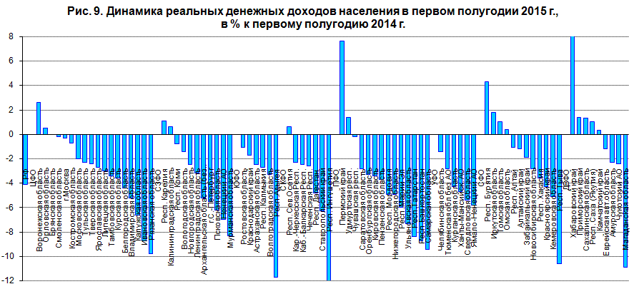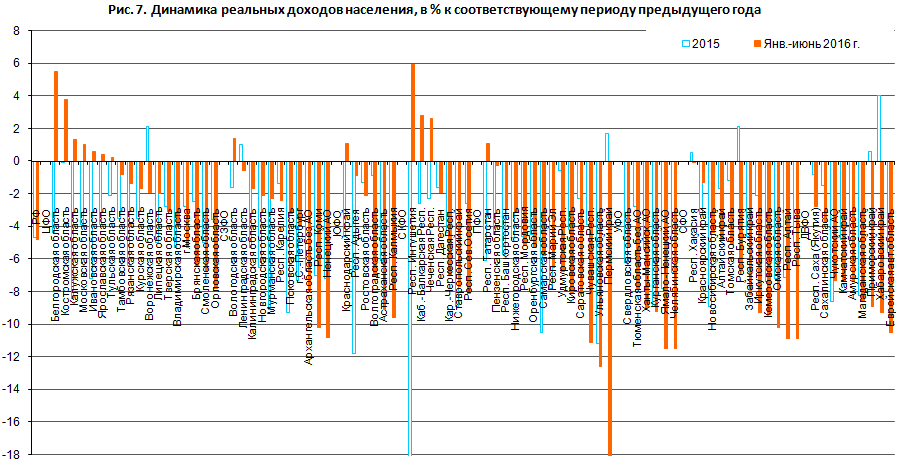 Наиболее острая проблема – продолжающийся спад реальных доходов населения, за первое полугодие 2016 г.он составил 4,8%. По данным Росстата, спад доходов имели 72 региона, в том числе все регионы востока страны и Урала, а также Приволжского ФО, за исключением Татарстана (рис. 7). При этом темпы спада в восточных регионах, на Урале и в половине регионов Приволжского ФО были максимальными, что не совпадает с динамикой экономических индикаторов. Помимо Татарстана, доходы населения выросли в трети областей Центра, в Вологодской области и Краснодарском крае, а также в половине республик Северного Кавказа и республике Крым (достоверность региональной статистики доходов населения, особенно по южным республикам, относительна). Рост доходов населения в ряде регионов промышленного Центра и аграрного Юга с более развитым АПК можно отчасти объяснить сохраняющимся ростом производства в оборонной и пищевой промышленности.