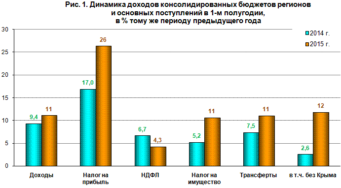 Рис. 1. Динамика доходов консолидированных бюджетов регионов и поступлений основных налогов в 2015 г., в % к 2014 г. |