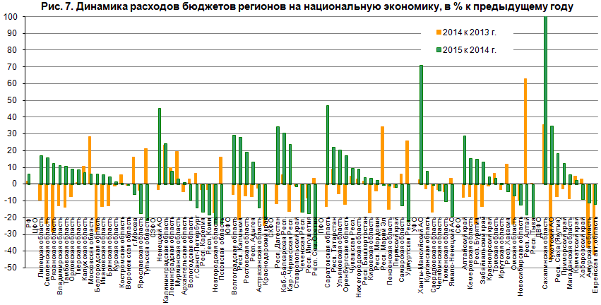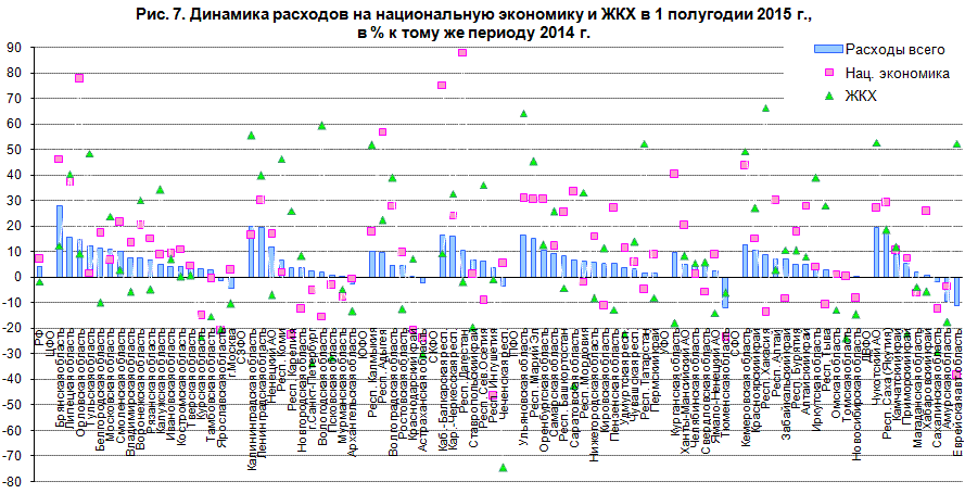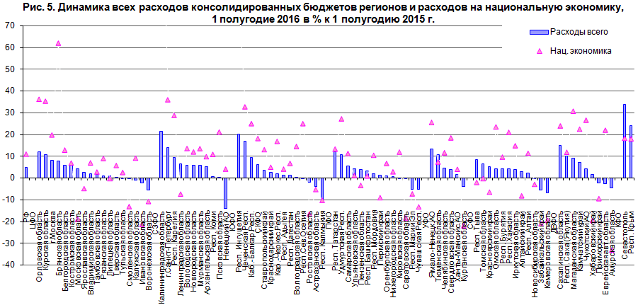 Рис. 5. Динамика всех расходов консолидированных бюджетов регионов и расходов на национальную экономику, 1 полугодие 2016 в % к 1 полугодию 2015 г. |