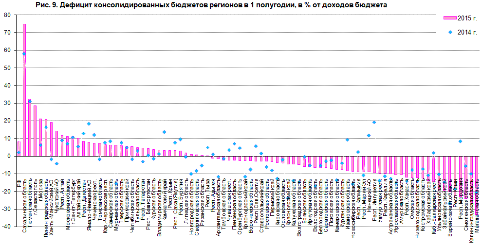 Следствием превышения расходов над доходами в большинстве регионов стал дефицит бюджетов. В первом полугодии 2016 г. его имели 52 региона, а в первом полугодии 2015 г. – 50 регионов (рис. 7). Если учитывать только регионы с превышением расходов над доходами, то их суммарный дефицит составил 109 млрд. руб. (в первом полугодии 2015 г. он был немного больше – 121 млрд. руб.). Если считать по всем регионам РФ, то картина более благополучна, профицит составил 277 млрд. руб., хотя он меньше, чем в первом полугодии 2015 г. (364 млрд.руб.). Итоговый "плюс" обеспечен, как обычно, огромным профицитом бюджетов Москвы (179 млрд. руб. или 20% от доходов бюджета столицы) и Сахалинской области (62 млрд. руб. или 54% от доходов бюджета области), а также значительных профицитов бюджетов Ханты-Мансийского АО (20 млрд. руб.), Тюменской области (17 млрд. руб.), Ленинградской области и С.Петербурга (по 14-15 млрд. руб.). Судя по полугодовым данным, к концу 2016 г. острота проблемы дефицита будет не меньше, чем в прошлом году, поскольку дисбаланс бюджетов регионов резко усиливается в ноябре-декабре из-за роста расходных обязательств.