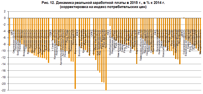 Реальные доходы населения выросли в первой половине 2012 г. на 4% относительно того же периода 2011 г. Годом раньше (первая половина 2011 г. к 2010 г.) они сократились на 1%, поскольку в этот период почти не повышались пенсии и зарплаты бюджетников. В большинстве регионов (56 из 82, данные по Чечне отсутствуют) темпы роста реальных доходов в 2012 г. были выше среднероссийских, а в Ивановской и Амурской областях они достигли 23-30%, что трудно объяснить. Отрицательную динамику имели в 2012 г. 9 регионов, в том числе Москва (-5%) и Сахалинская область (-3%), что также трудно объяснимо.