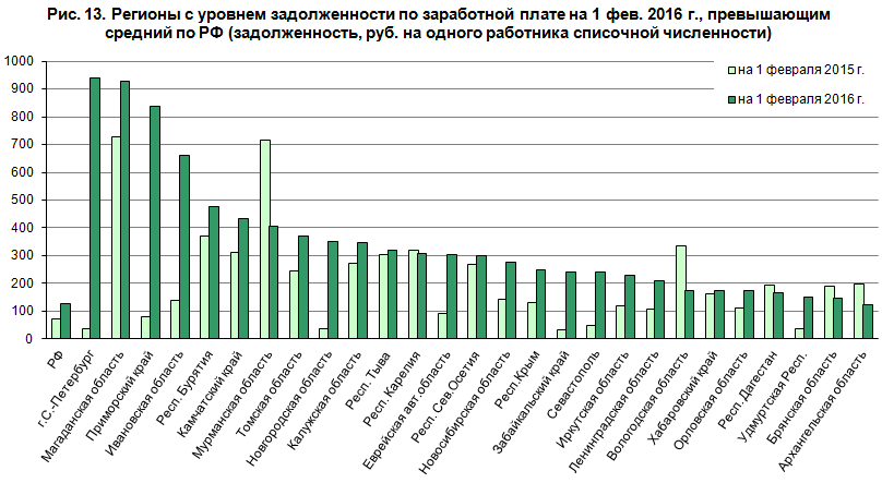 Статистика просроченной задолженность по заработной плате также не показывает ухудшения ситуации на рынке труда: с начала апреля до начала августа 2016 г. задолженность сократилась на 18%. Реальная ситуация явно хуже, т.к. статистика учитывает только занятых на крупных и средних предприятиях и организациях и в целом не очень достоверна. В региональном разрезе более проблемная ситуация на Дальнем Востоке: в Приморском крае задолженность в расчете на одного занятого списочной численности в 10 раз выше средней по стране, в большинстве остальных регионах Дальневосточного ФО – в 3-5 раз выше средней. Повышенной задолженностью по заработной плате отличаются также Мурманская, Томская области и Бурятия. Но проблема задолженности пока не стала общероссийской: в половине регионов она минимальна, а в 11 регионах задолженности нет.