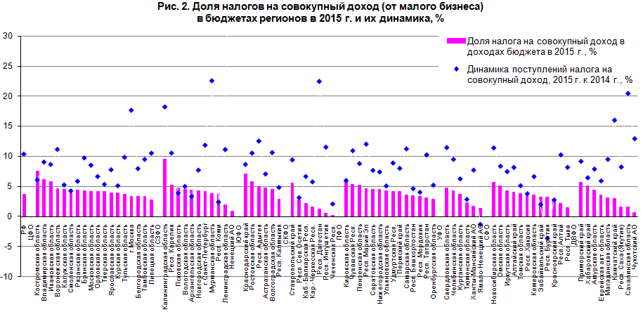 Рис. 2. Доля налогов на совокупный доход (от малого бизнеса) в бюджетах регионов в 2015 г. и их динамика, % |