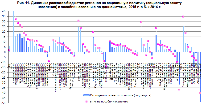 Только три региона сократили в первом полугодии 2016 г. все основные виды социальных расходов – Ненецкий АО, республика Калмыкия и Брянская область. В 38 регионах расходы по всем основным видам выросли, особенно сильно – в Сахалинской, Тюменской и Ленинградской областях, которые имеют высокую бюджетную обеспеченность и профицит, а также в Чечне за счет роста трансфертов. Предвыборный период явно наложил отпечаток на динамику социальных расходов бюджетов большинства регионов.