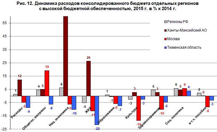 Быстрее всего в первом полугодии 2016 г. росли расходы на национальную экономику. Самым значительным ростом – почти в 2,5 раза по сравнению с первой половиной 2015 г. – выделялась Калининградская область, которой в три раза увеличены трансферты из федерального бюджета после отмены льготного режима особой зоны. Но важнее всего рост расходов по этой статье в Москве (на 20%), поскольку на столицу приходится каждый четвертый рубль, который все регионы тратят на национальную экономику. Сократили расходы только 24 региона, в т.ч. половина регионов Сибирского и Южного ФО, треть регионов Центра (рис. 5). На Дальнем Востоке сократили расходы на национальную экономику наиболее заселенные Приморский и Хабаровский края, а также Амурская область. Именно в этих регионах в основном выделяются "дальневосточные гектары", но как к ним добраться без развития инфраструктуры?