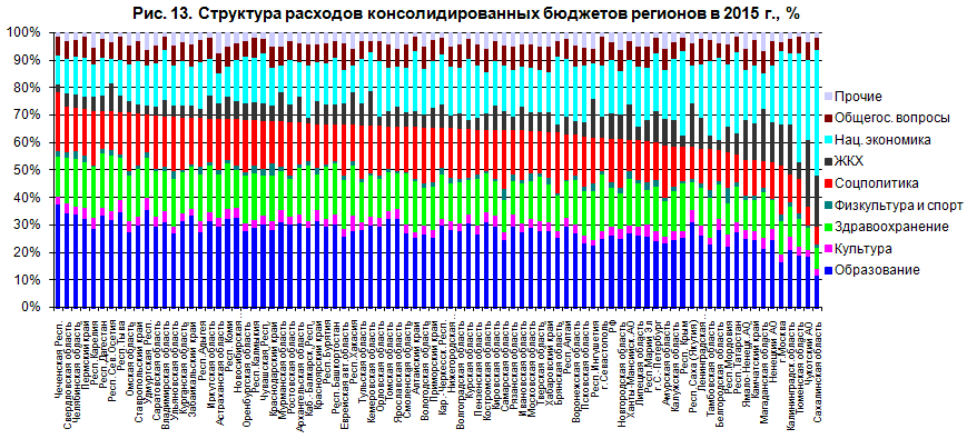 Расходы на социальную политику в 2012 г. выросли на 7%, т.е. на темпы инфляции, а социальные выплаты населению, составляющие 73% всех расходов на соцполитику, еще медленнее – на 5%. Динамика расходов на социальную политику была разной: от роста на 73% в Краснодарском крае, на 51% – в Карачаево-Черкесии, на треть – в Тыве и Ненецком АО до сокращения в 18 регионах, в т.ч. в Кировской области – на 10%, в республиках Ингушетия, Алтай, Кабардино-Балкария, в Брянской, Курской областях, Забайкальском крае и С.-Петербурге – на 5-7% (рис. 16). Почти двукратный рост расходов на социальную политику в Краснодарском крае обусловлен увеличением выплат населению почти в два раза (на 16 млрд. руб.), в основном это материальная помощь жителям г. Крымск после наводнения. Возможно, на рост расходов повлияли и выплаты компенсаций населению Сочи за изымаемые под строительство олимпийских объектов земельные участки. Значительный рост расходов на социальную политику в Карачаево-Черкесии и Тыве также обусловлен ростом выплат населению в 1,5 раз, но причины этого неизвестны. Северная столица проводила в 2012 г. жесткую политику экономии не только расходов на социальную политику, но и расходов на здравоохранение. И даже в расходах на образование, которые все же росли, темпы роста были в 3,5 раза ниже средних по регионам РФ. В своих приоритетах С.-Петербург резко отличается от Москвы.