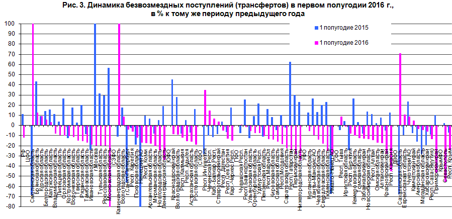 Рис. 3. Динамика безвозмездных поступлений (трансфертов) в первом полугодии 2016 г., в % к тому же периоду предыдущего года |