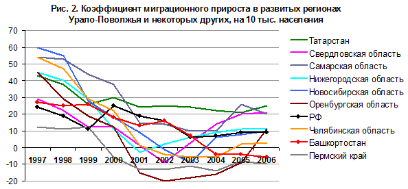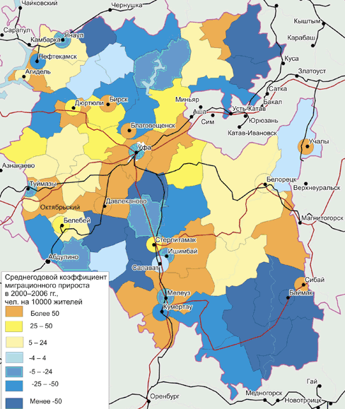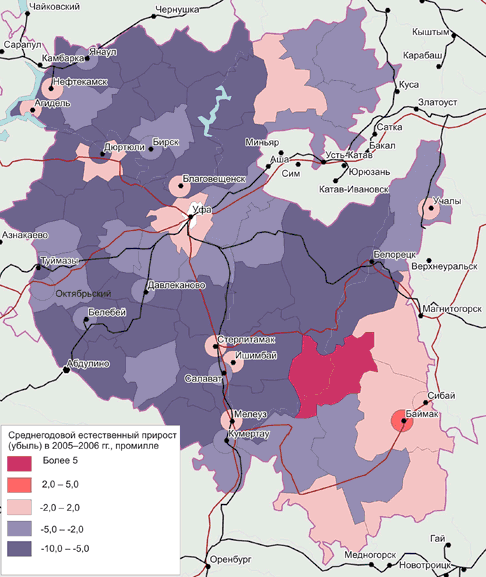 В Башкортостане нет типичной для Центральной России зависимости скорости депопуляции от размера города – чем он меньше, тем, как правило, сильнее сокращается его население. Наоборот, в небольших городах республики, которые являются местными центрами окружающей сельской местности, продолжается рост населения благодаря миграционному перетоку из села, поскольку процесс урбанизации не завершен и сельская местность обладает значительными человеческими ресурсами. Наиболее стабильны небольшие города в центре республики и лишь несколько более крупных: ключевой центр юго-востока — Сибай, и второй по величине город региона Стерлитамак (табл. 1). Остальные крупные города депопулируют медленней, чем столица, эта инверсия также отличает республику от русских регионов.