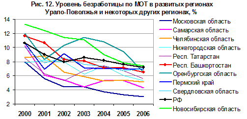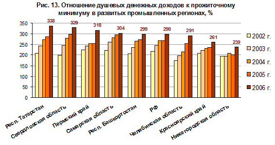 Низкий прожиточный минимум всегда способствует смягчению проблемы бедности в статистическом измерении. По уровню бедности Башкортостан относится к группе благополучных регионов, доля населения с доходами ниже прожиточного минимума составляла в 2006 г. менее 15%, что ниже средней по стране (рис. 17). За последние семь лет было достигнуто более чем двукратное сокращение доли бедных, но с каждым годом этот процесс идет все медленнее. Одно из основных препятствий на пути дальнейшего сокращения бедности — высокая доля жителей села, вступающего в период болезненной перестройки структуры собственности и технологической базы АПК на фоне ослабления патерналистской поддержки коллективного сектора со стороны властей. Еще один “резерв” снижения бедности в регионе — депрессивные городские центры.