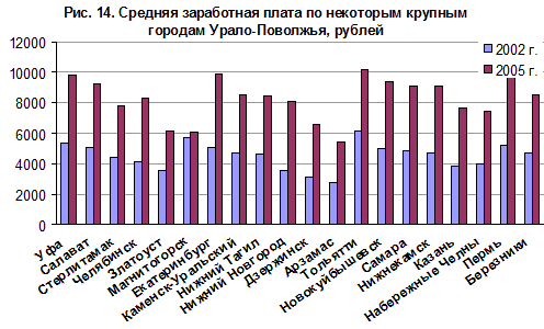 Дифференциация муниципалитетов республики по уровню зарплаты за последние десять лет выросла. В число лидеров, кроме столицы, входят центры нефтехимии (Салават), разнообразной, основной химии (Стерлитамак), энергетики (Нефтекамск), производства медного концентрата (Учалы). Города, в которых средний уровень зарплаты определялся нефтедобывающей отраслью, за последние годы потеряли лидирующие позиции в результате перераспределения финансовых ресурсов (рис. 15), такая динамика типична для большинства российских моногородов экспортной промышленности. Постдефолтный подъем обеспечил ускорение роста зарплат в машиностроительных центрах (Ишимбай, Октябрьский, Белебей, Дюртюли), но в середине 2000-х темпы роста замедлились, что сразу сказалось на динамике заработков.