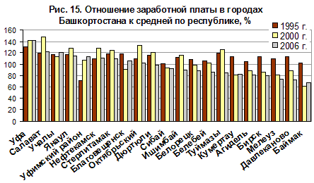 | | Рис. 15. Отношение заработной платы в городах Башкортостана к средней по республике, % |