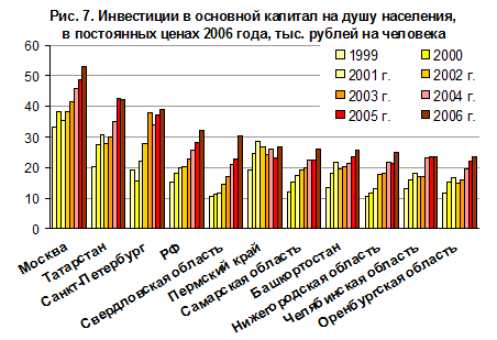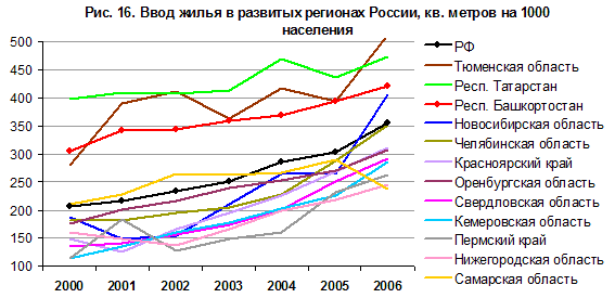 | | Рис. 16. Ввод жилья в развитых регионах России, кв. метров на 1000 населения |