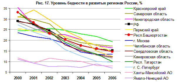 | | Рис. 17. Уровень бедности в развитых регионах России, % |