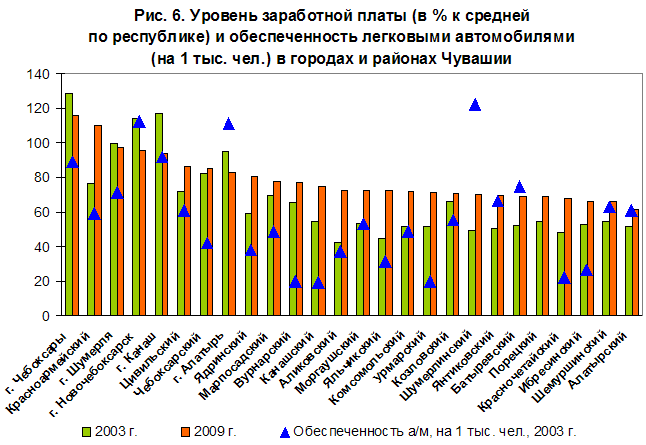 | | Рис. 6. Уровень заработной платы (в % к средней по республике) и обеспеченность легковыми автомобилями (на 1 тыс. чел.) в городах и районах Чувашии |