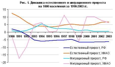 Демография. Динамика населения и ее компоненты отражают основные периоды развития округа: 1970-е годы были периодом максимальных темпов роста численности населения за счет миграционного притока, но и в 1980-е годы рост был значительным, опираясь уже не только на миграционные ресурсы, но и на высокую рождаемость молодого населения. За 1970–1989 гг. население округа выросло в 4,7 раза (с 271 до 1282 тыс. человек). На Тюменский Север приезжали работать мигранты из разных регионов СССР, но очень значительным был приток из восточной Украины, недаром в народе округ прозвали "Хохлы-Мансийским". С распадом СССР произошло кратковременное сокращение численности населения из-за возвратного миграционного оттока на Украину, где в эти годы отменили льготы и северные пенсии работающим в России. Последующий рост был небольшим и происходил за счет обоих источников — сохранившегося естественного прироста и миграций в более богатый регион, за исключением краткосрочного оттока населения в период спада цен на нефть и сокращения заработков после дефолта (1998–1999 гг.). Отметим, что миграционная ситуация в ХМАО уже к середине 1990-х годов стала определяться экономическими факторами раньше, чем в других регионах России. К 2003 г. население ХМАО увеличилось до 1433 тыс. человек. Динамика численности населения ХМАО и ее компоненты кардинально отличались как от общероссийских тенденций (рис. 1), так и демографической ситуации в других регионах Севера, откуда население уезжало весь переходный период. Схожую с ХМАО демографическую ситуацию имеет только богатый "сосед" — газодобывающий Ямало-Ненецкий АО. Переходный период показал, что нефтедобывающий округ уже не может стать зоной вахтового освоения, он сохранил устойчивый каркас расселения и положительную динамику численности жителей.