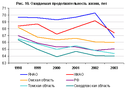 Социальная сфера. Позитивные социальные изменения в ХМАО проявляются в улучшении качества населения и развитии социальной сферы. Если измерять состояние здоровья населения округа с помощью показателя ожидаемой продолжительности жизни, то позитивные сдвиги наиболее очевидны: в северном регионе с неблагоприятными климатическими условиями население живет заметно дольше, чем в подавляющем большинстве областей Центральной России благодаря более высокому долголетию мужчин — 64,3 года при среднероссийских 58,3. Более того, на фоне продолжающегося снижения долголетия в целом по стране в ХМАО в последние годы начался рост продолжительности жизни (рис. 10). По показателям младенческой смертности ХМАО также относится к самым благополучным регионам страны — 8,8 смертей на 1000 родившихся при среднероссийском показателе 13,3. Лидерские позиции обоих тюменских округов объясняются прежде всего более высокими доходами населения, но определенную роль сыграло и развитие здравоохранения. Если в советское время по всем показателям обеспеченности здравоохранения ХМАО сильно отставал от средних по России, то к 2002 г. обеспеченность почти сравнялась (врачами, больничными койками) или даже превысила среднероссийскую (мощность поликлиник, обеспеченность средним медицинским персоналом).