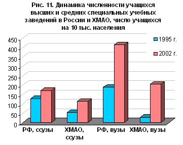 Рис. 11. Динамика численности учащихся высших и средних специальных учебных заведений в России и ХМАО