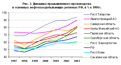 По объему промышленного производства округ занимает устойчивое 1-е место среди субъектов РФ, его доля за 1990–2002 гг. выросла с 2,3 до 8,1% (без дооценки на неформальную деятельность). ХМАО — моноотраслевой регион, где добывается более 55% российской нефти, поэтому в отраслевой структуре экономики доминирует топливная промышленность (88%), еще 7% приходится на электроэнергетику. Спад промышленного производства в первой половине 1990-х гг. был в округе менее сильным, чем в среднем по стране, поэтому уровень производства в 2002 г. составил 72% от показателя 1990 г. (в среднем по РФ — 63%). По сравнению с другими нефтегазодобывающими регионами ХМАО по динамике промышленного производства отстает не только от более устойчиво развивавшегося Ямало-Ненецкого АО, но также от Самарской области и Татарстана, которые отличаются более диверсифицированной экономикой и поэтому смогли легче пережить переходный период (рис. 2). Но в последние годы монопрофильность стала способствовать ускоренному росту промышленного производства в ХМАО, так как высокие цены на нефть стимулируют рост нефтедобычи.