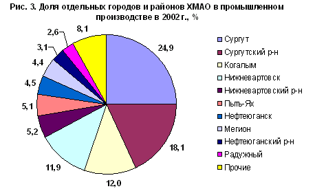 Рис. 3. Доля отдельных городов и районов ХМАО в промышленном производстве в 2002 г.