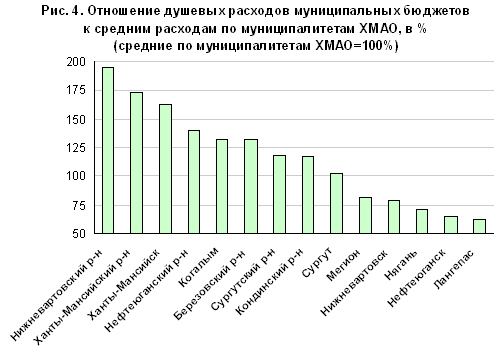 Рис. 4. Отношение душевых расходов муниципальных бюджетов к средним расходам по муниципалитетам ХМАО (средние по муниципалитетам ХМАО=100%)