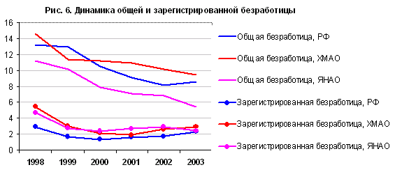 Несмотря на быстрый рост экономики, уровни общей и зарегистрированной безработицы в ХМАО были и остаются худшими по сравнению со средними по стране. Проблемы безработицы в ХМАО острее и по сравнению с "соседом" — Ямало-Ненецким АО (рис. 6). Причины в продолжающемся росте численности трудоспособного населения при ограниченных возможностях трудоустройства в нефтяной отрасли, которая не относится к трудоемким, и в пока еще недостаточно развитом секторе услуг. ЯНАО же как более северный регион имел меньший приток мигрантов в последнее десятилетие, но важнее то, что "Газпром", оставаясь фактически государственной компанией, проводит менее жесткую политику оптимизации занятости по сравнению с частными нефтяными компаниями. Новые рабочие места в обоих автономных округах создаются реже, чем в более освоенных районах страны: если в среднем по РФ на одну вакансию в 2002 г. приходилось 2,1 безработных, то в ХМАО — 4,4, а в ЯНАО — 4,0 человека. Только за 2002 г. нагрузка безработными на одну вакансию в обоих округах выросла почти вдвое.