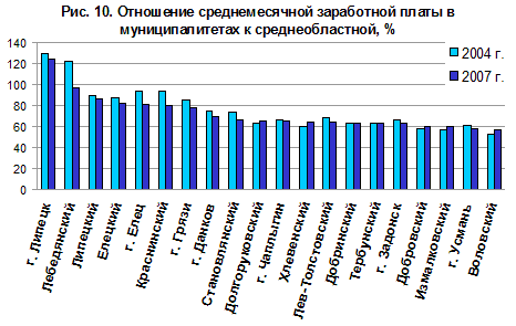 Перераспределительная политика обеспечила повышение заработков в бюджетном секторе и, как следствие, некоторое выравнивание муниципальных образований по уровню заработной платы, поскольку в слаборазвитых периферийных районах бюджетники являются одной из наиболее многочисленных групп занятых. Отрыв крупных городов и наиболее успешных районов за последние годы сократился (рис. 10). Как правило, для областных центров это нехарактерно, их преимущества растут, в том числе и в заработках. Но в случае Липецка, скорее всего, доминирующей оказалась тенденция более медленного роста заработков в металлургии, типичная для всех промышленных городов страны с экспортной специализацией. Явная утрата преимуществ Лебедянским районом, где базируется крупная компания ОАО «Лебедянский», может быть обусловлена ее корпоративной политикой в сфере оплаты труда и ценовой политикой в отношении районных поставщиков аграрной продукции, что повлияло на оплату труда в агросекторе.